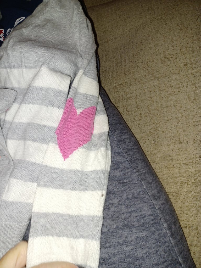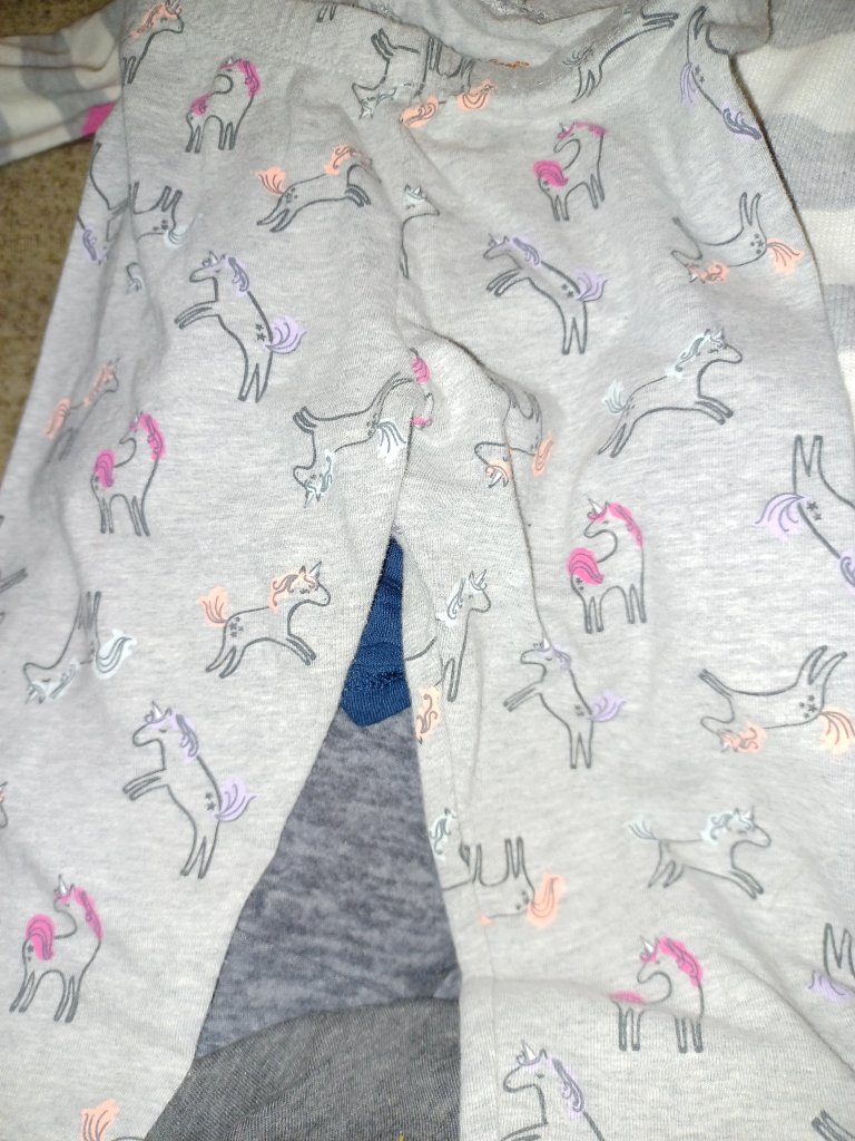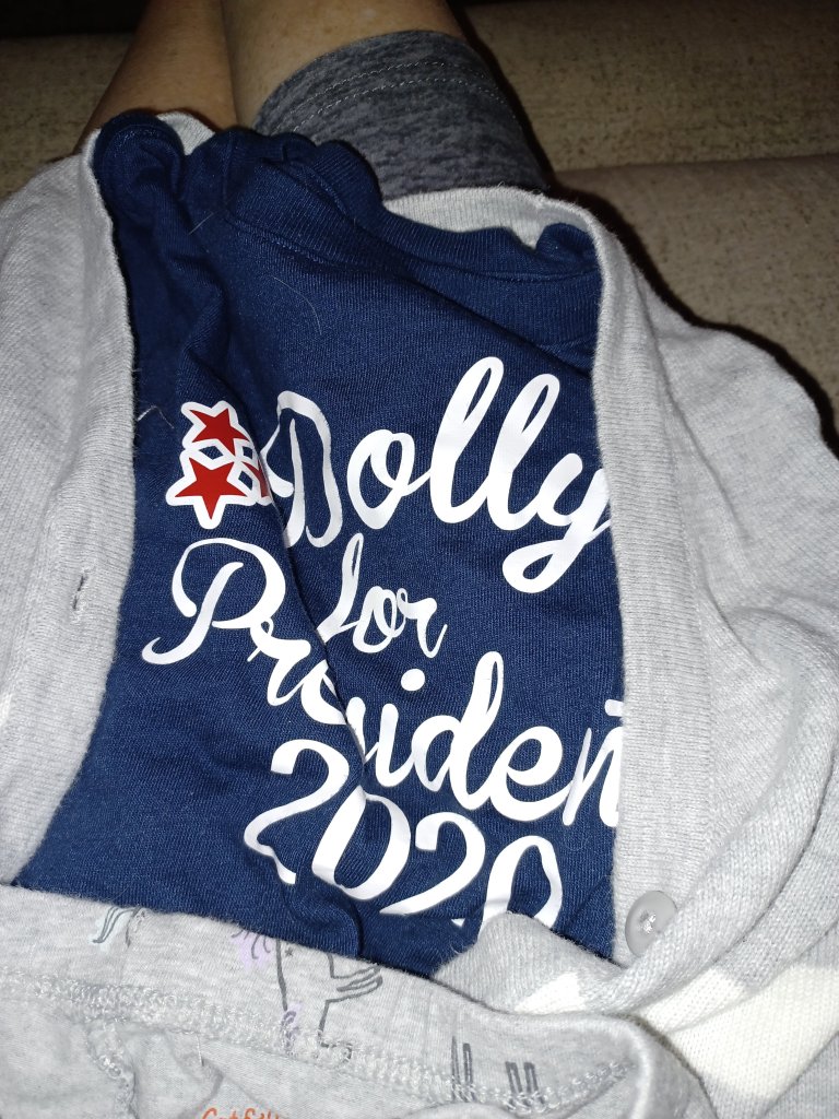 Kimber (8 years old) is picking out her own clothes. I’m silently screaming 😱 inside. She asked me what I thought about this outfit. I sent her back up to get socks so I could get a picture. Dolly for President 2020 shirt. Gray and white striped cardigan with a pink heart on the elbow. Unicorn leggings.